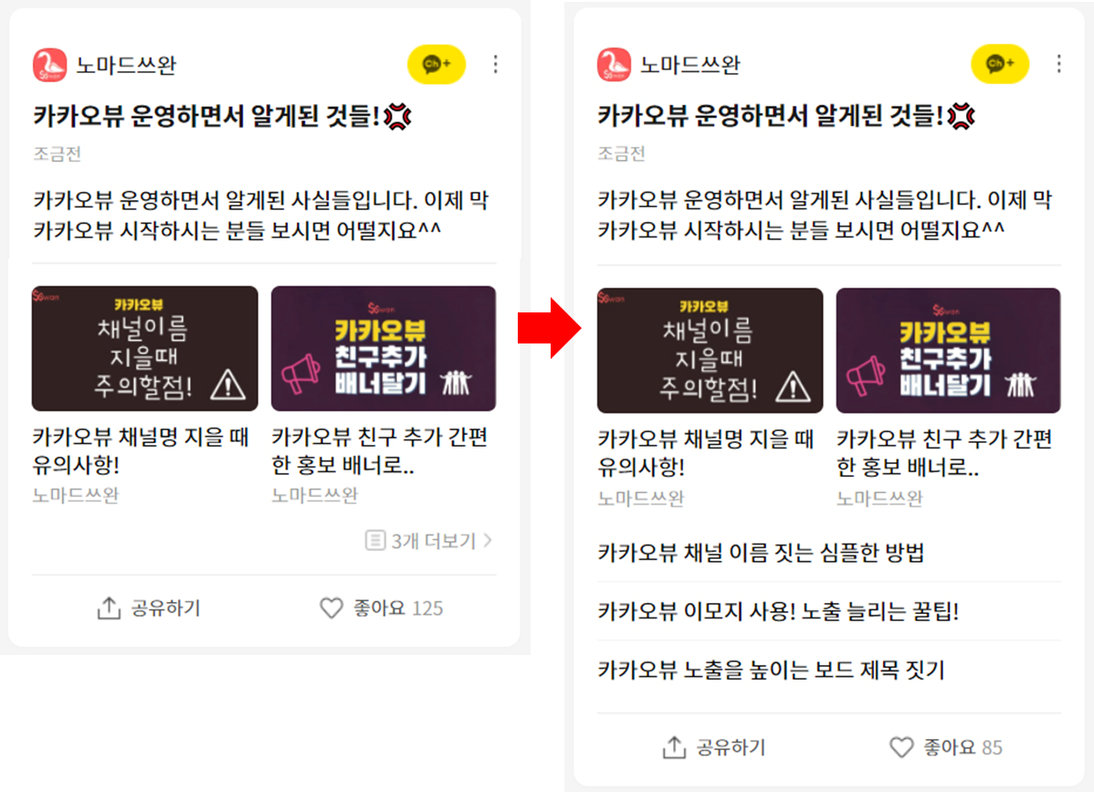 한번 보고 흘려버리는 재미, 흥미 위주 콘텐츠라면 빅썸네일이 더 나을거예요. 저 같은 경우 이런 콘텐츠는 큐레이션을 많이 하지 않아도 어느 정도 노출이 나와요. 여러개의 콘텐츠를 큐레이션 한 경우에도 그 중 썸네일이 사람들의 이목을 끌 수 있는 걸로 특히나 괜찮은 게 있다면 빅썸네일이 좋겠죠.