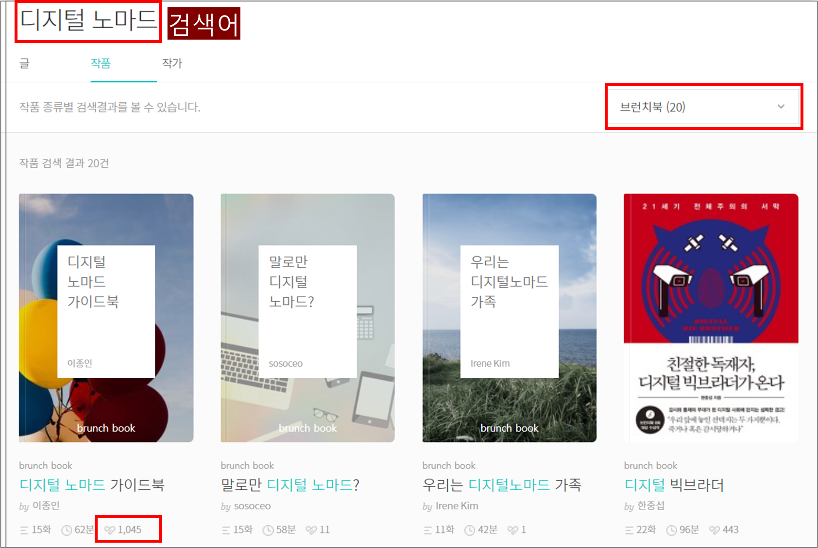 카카오 브런치에서 '디지털 노마드'로 검색을 하면 글 / 작품 / 작가 별로 검색 결과를 보실 수 있습니다. <글> 탭에서 가져와도 되긴 하지만 <작품> 탭의 브런치 북에서는 좋아요 숫자를 확인하실 수 있습니다. 그래서 좋아요 숫자가 많은 브런치 북에 들어가셔서 해당하는 글을 가져오시면 좀 더 완성도 있는 콘텐츠를 가져올 수 있지 않을까 여겨집니다.