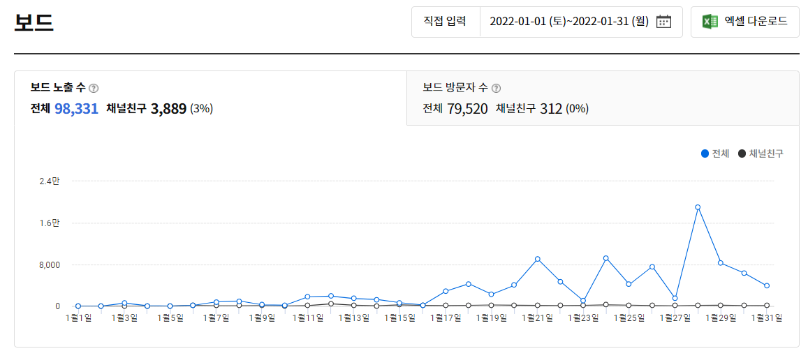 제 채널의 1월 보드 노출 수는 98,331이고 보드 방문자 수는 79,520입니다.