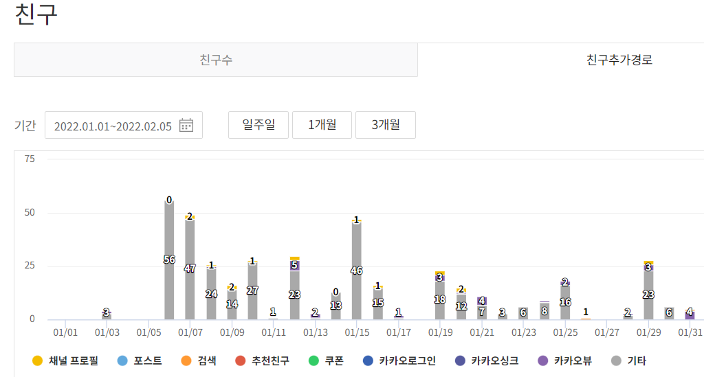 저의 친구 수는 2월 6일 현재 411명입니다. 1월에 만든 친구는 대부분이 맞추이고, 순수하게 채널추가를 해준 친구는 47명이네요. 위 차트에서 회색인 기타 숫자를 맞추 친구로 보시면 됩니다. 멀리보고 정석대로 가려고 현재는 3개 채널 모두 의미없는 맞추는 하지 않고 있습니다.