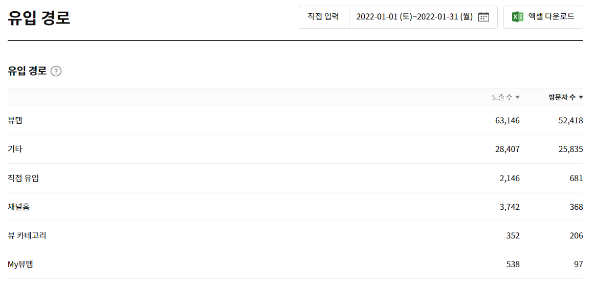 2022년 새해가 시작되고 벌써 한달이 훌쩍 가버렸습니다. 이렇게 빠르게 시간이 흐르는건 슬프지만 또 할건 해야죠^^ 카카오뷰 채널을 12월 말에 만들고 본격적으로 시작한 건 1월 초가 지나서입니다. 오늘은 1월 카카오뷰 노출 및 방문자에 대한 통계분석을 해보면서 앞으로 어떻게 운영을 해야 노출이 잘되고 방문자가 늘지 고민해보는 시간을 가져보려합니다. 제 채널 통계분석은 달이 끝나는 시점에 매월 진행해보겠습니다.