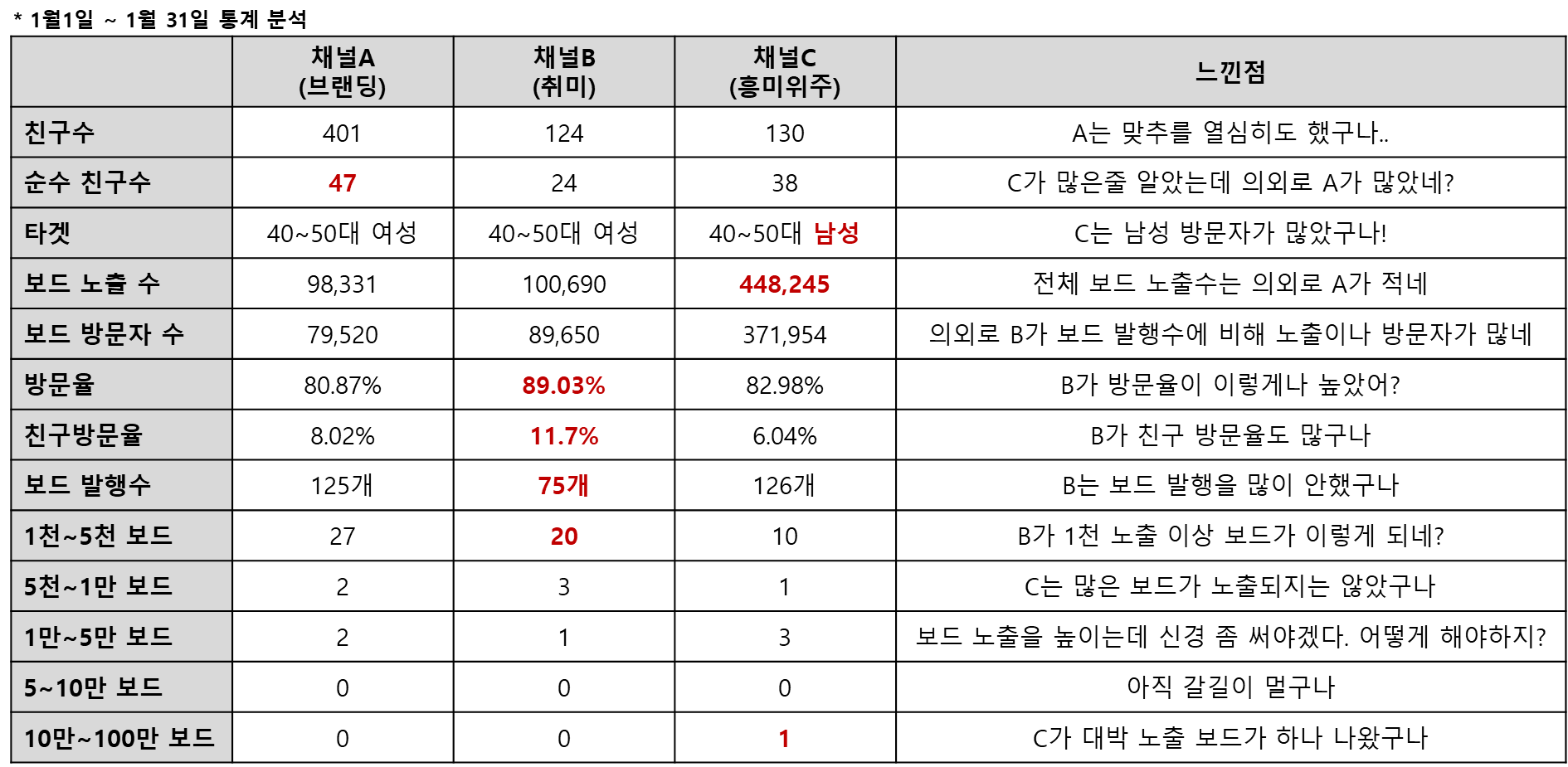 방문율 80.87%, 친구방문율 8.02% 로 역시 My뷰의 친구 방문율은 매우 적습니다. 친구들이 내 보드를 봐주려면 맞추보다는 진짜 내 채널을 좋아하는 사람들이 채널추가를 해줘야합니다. 그렇게 되게 하려면 보드의 퀄리티를 올려야할텐데 이 부분이 참 고민이 되죠. 2월에는 제 콘텐츠를 많이 제작하고, 채널추가를 유도하는 퀄리티높은 시리즈물 콘텐츠를 기획해봐야겠습니다. 이런 부분은 인기가 높았던 보드를 분석해보면서 방향을 잡아보려 합니다. 그래도 한달간의 차트 추이를 보면 조금씩 성장했음이 느껴져 뿌듯하네요^^