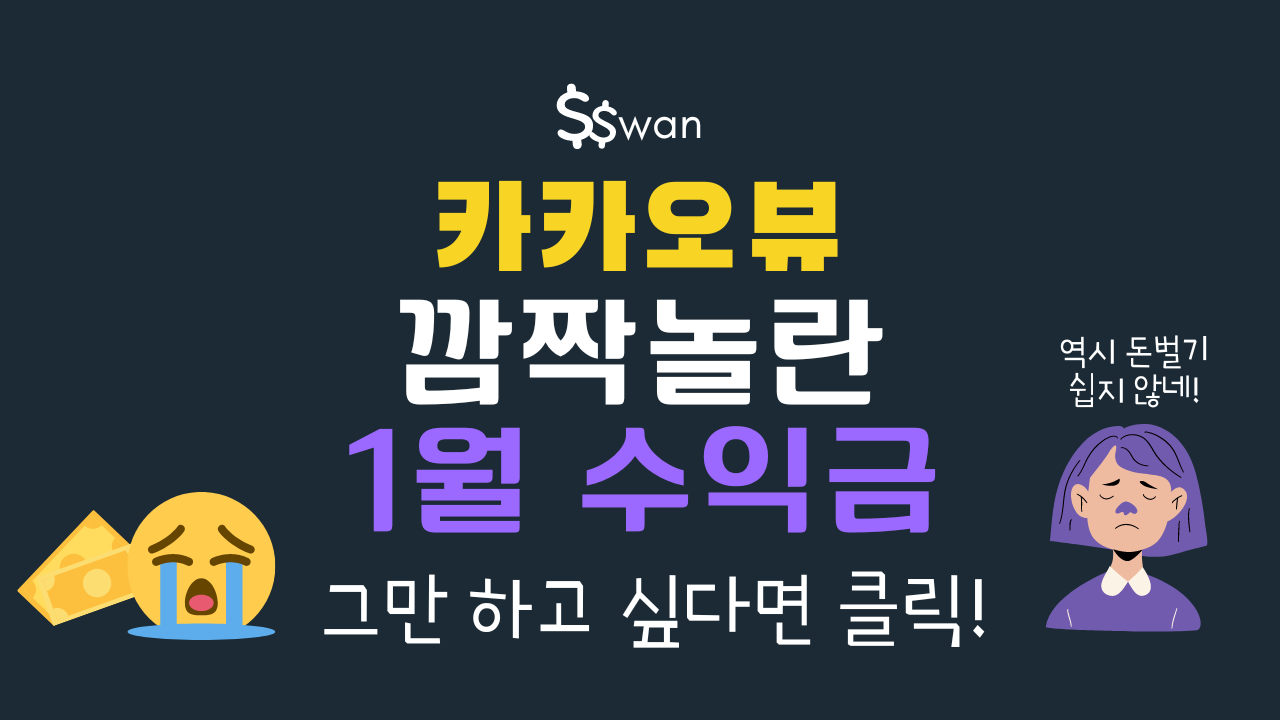 지난 2월 25일 금요일에 드뎌 1월 수익 정산 내역이 오픈되었는데요. 이번에 수익금이 그리 크지 않을거라는 말이 많이 있어서 크게 기대는 안했지만 막상 나온걸 보니 생각보다 너무 적게 나와 조금 허탈했습니다. 역시 집에서 돈벌기는 쉬운 일이 아닌 것 같습니다. 소소한 금액이지만 카카오뷰는 저의 디지털노마드 시작점이라서 저의 정산금 공개와 함께 제가 느낀 점을 적어보려고 합니다.