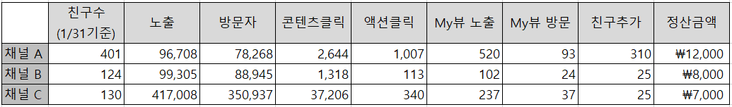 노출은 채널 C가 가장 많지만 그렇다고 노출만으로 수익이 되지는 않습니다. 그리고 카카오에서 얘기한 것 처럼 뷰탭이나 기타 노출보다 My뷰 노출과 방문이 중요한 듯 합니다.