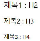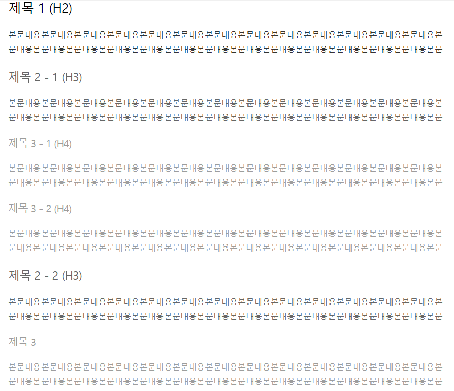 H태그는 뒤죽박죽 섞지 마시고 아래와 같이 순서대로 넣어주세요. H2가 없는데 H3를 먼저 쓰지 마지고 소제목을 넣을 경우 꼭 H2를 먼저 사용해주시기 바랍니다. 보기 좋게 아래와 같이 편집만 하는 것이 아니라, H2의 내용과 관련된 내용들이 하위 태그에 작성되어 한다는 것도 유의해주세요. 아래 예시를 보시면 좀 더 이해가 편하실 것입니다. H태그 별로 구분하기 편하게 색상 차이를 줘봤습니다.